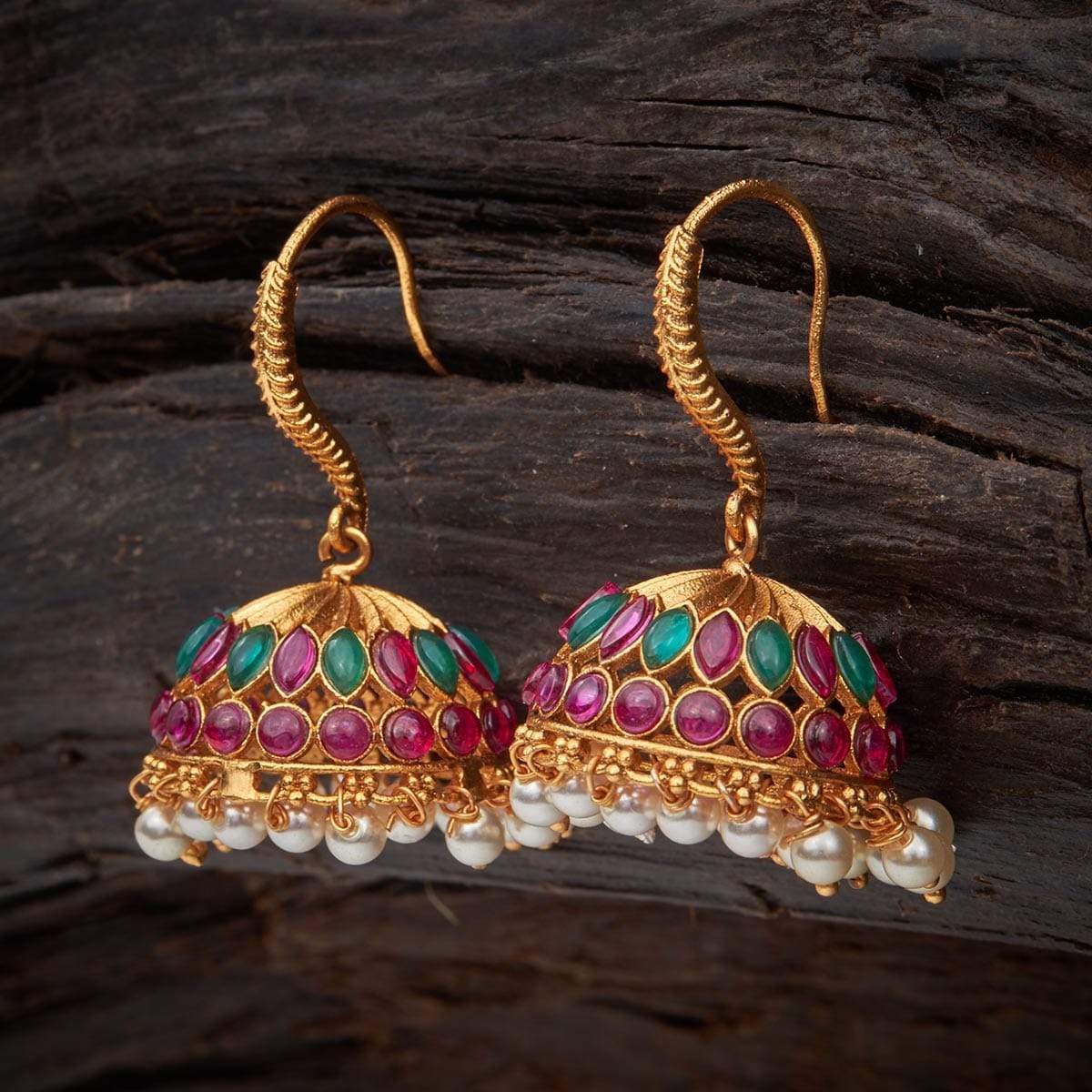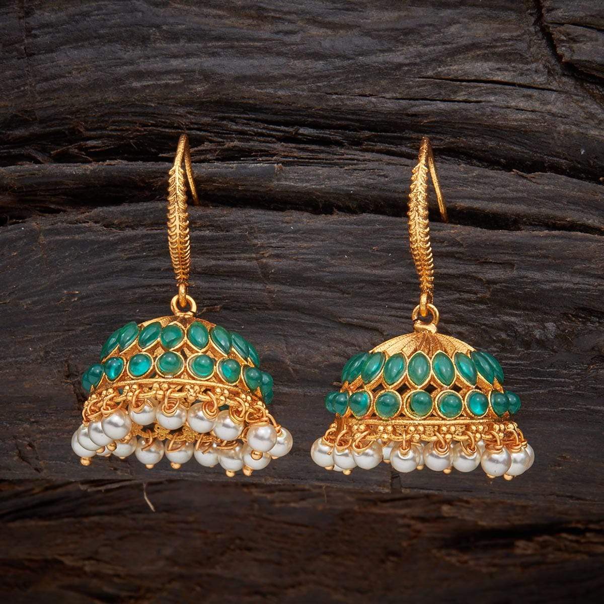 Drift away from the old designs and get your hands on these beautiful gold polished Jhumka earrings. It is perfectly detailed with minimal ruby-green stones and adds just the right touch of grace to your look.
