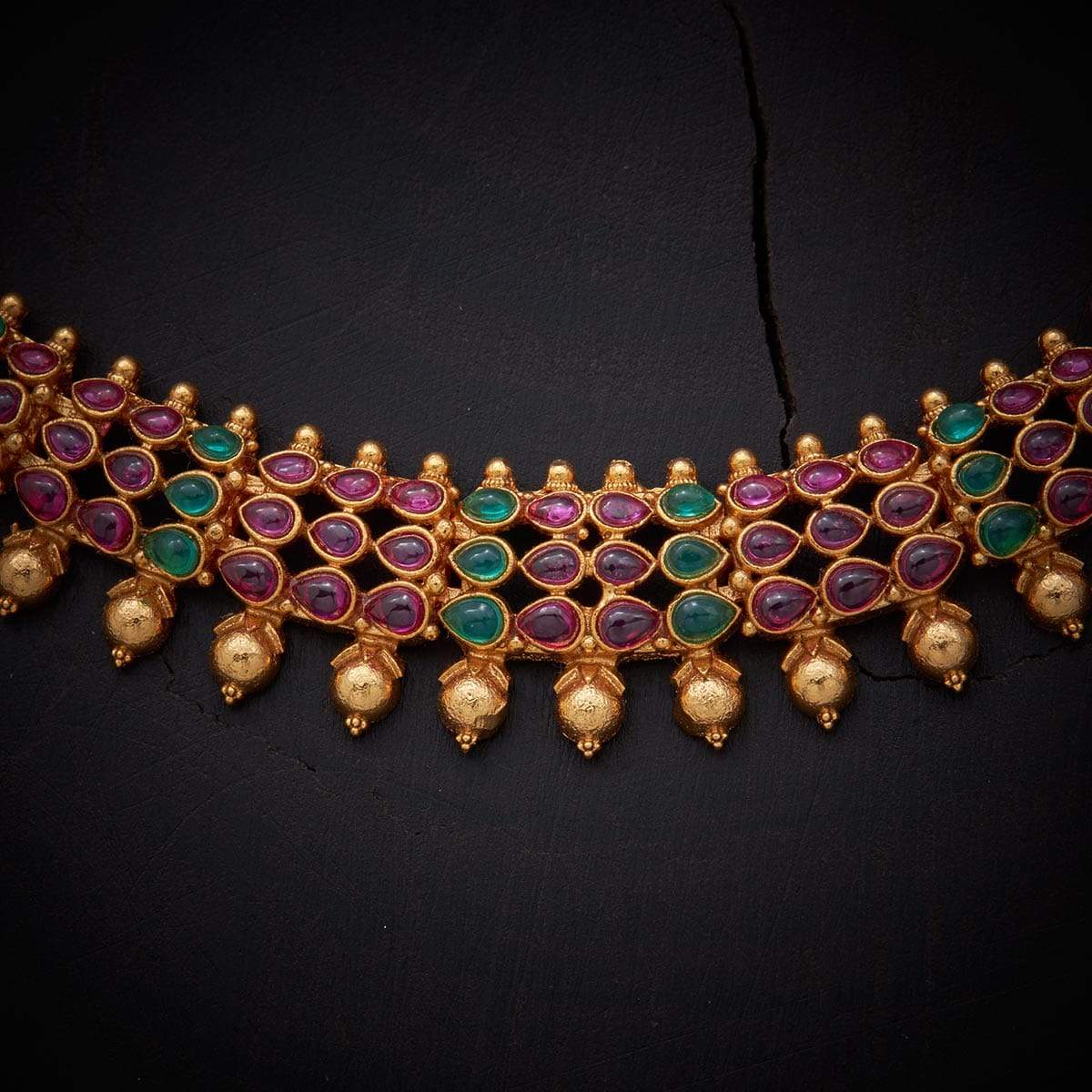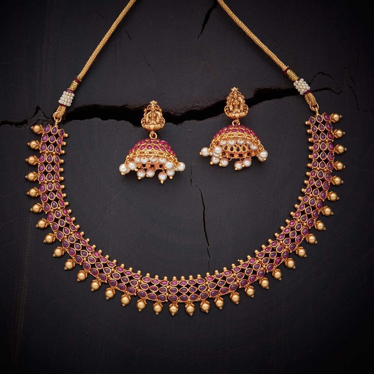Elegant and graceful, this gold-plated Antique Necklace set is designed with three layers of sparkling green and ruby pink stones. It comes with a pair of matching jhumkas that are beautifully adorned with glossy white beads.