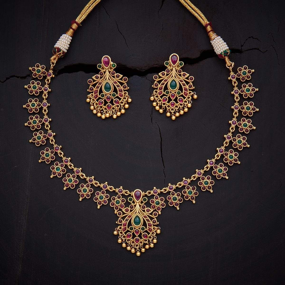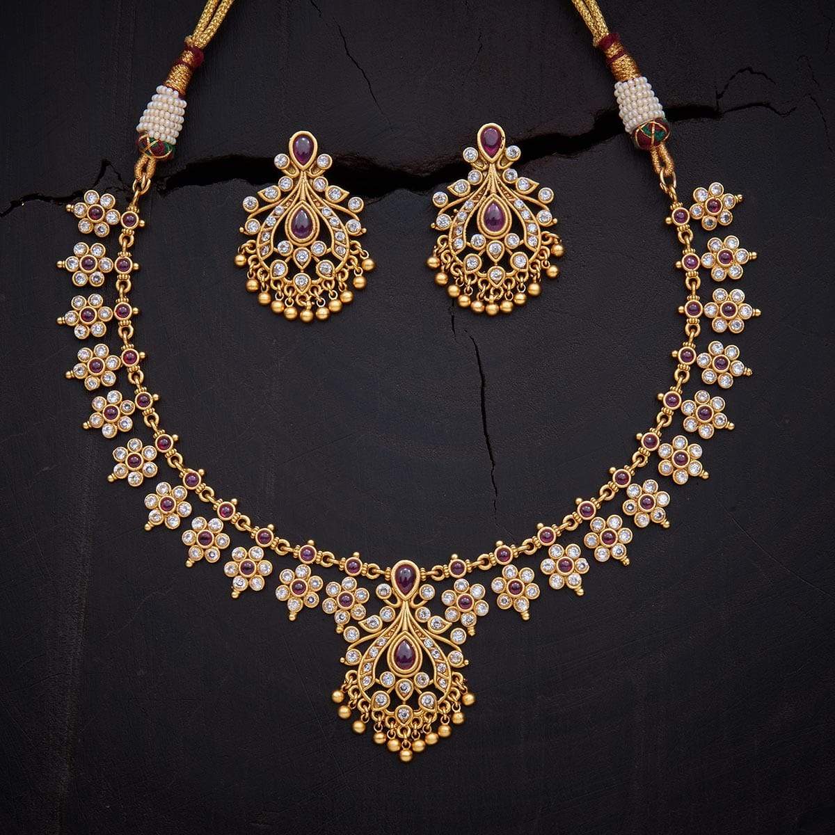 About the Product: Feminine, divine, and superior design express the beauty of these antique necklaces. Incorporating intricate details like unique flowers and detailed pendants with golden beads at the edges makes them even more stunning. The dainty flower design offers grace and elegance, while the bold ruby stones offer a superior glow. The matching earrings magnify your buzz while making you the centre of attention on all occasions.