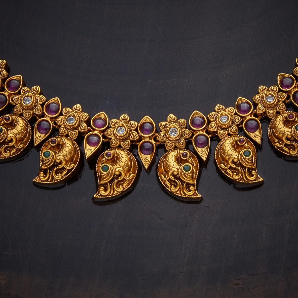 This gold-plated long bridal necklace is designed with intricately carved paisley motifs and graced up with dazzling stonework. Pair it with an antique choker necklace for a royal appeal on your wedding day.
